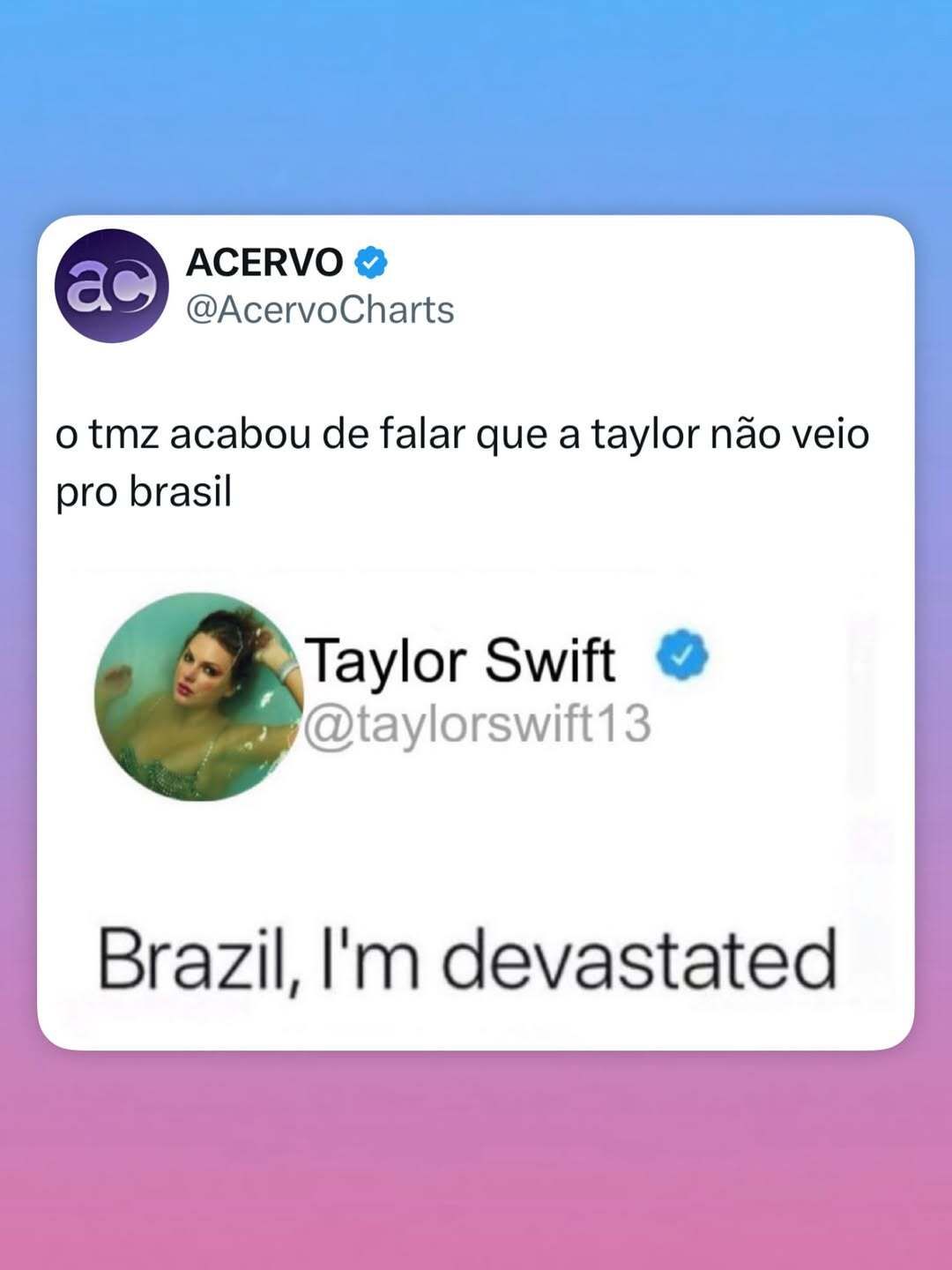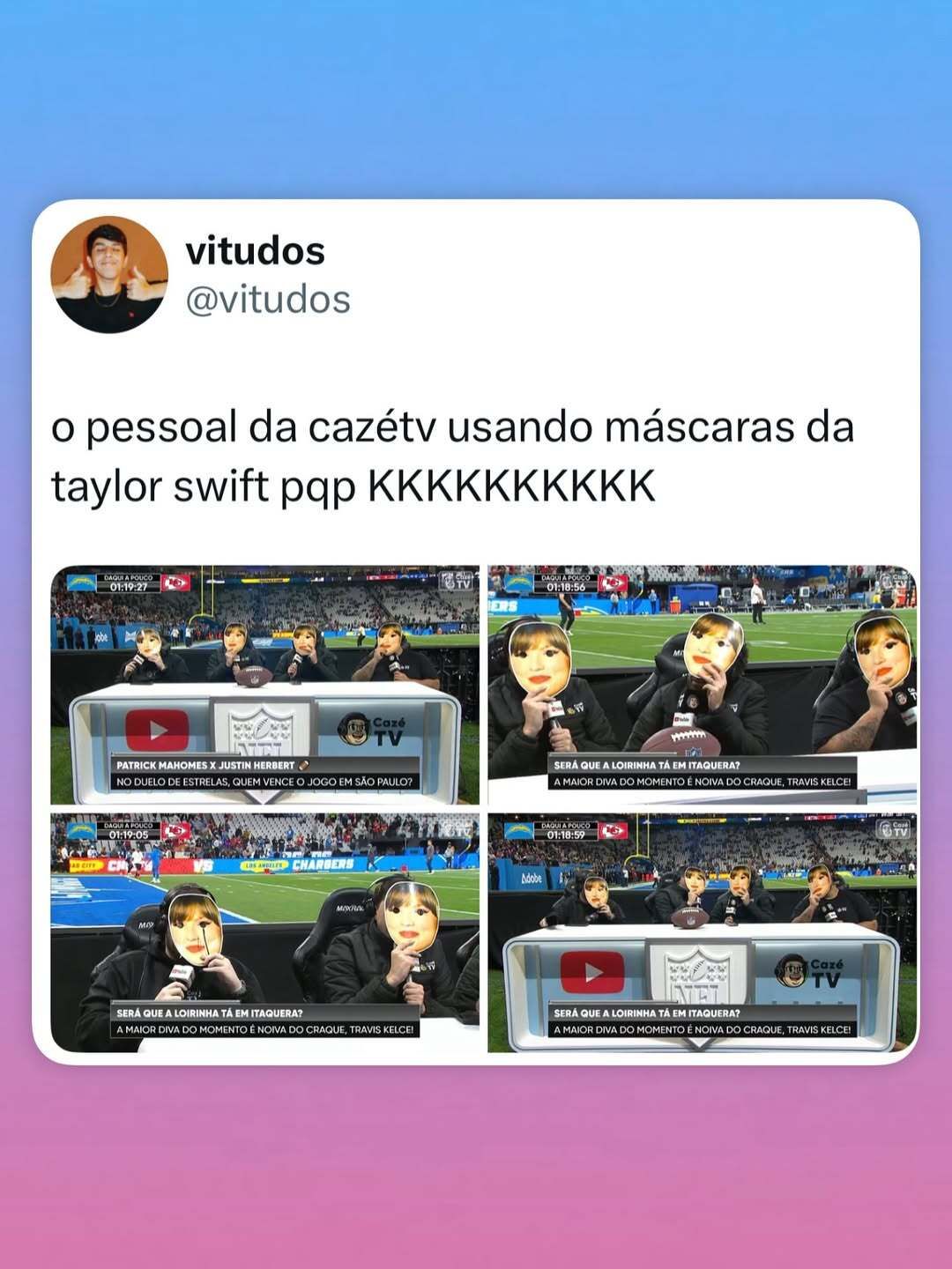 No tópico de expectativas, aqui no Brasil só se falava em uma presença no jogo de São Paulo: Taylor Swift. De fato, por ser um jogo dos Chiefs — time do Travis Kelce, noivo da cantora — em início de temporada, muito se especulou sobre a vinda da cantora ao Brasil e a Globo chegou a confirmar na transmissão, mas a loirinha não veio. 😥😥