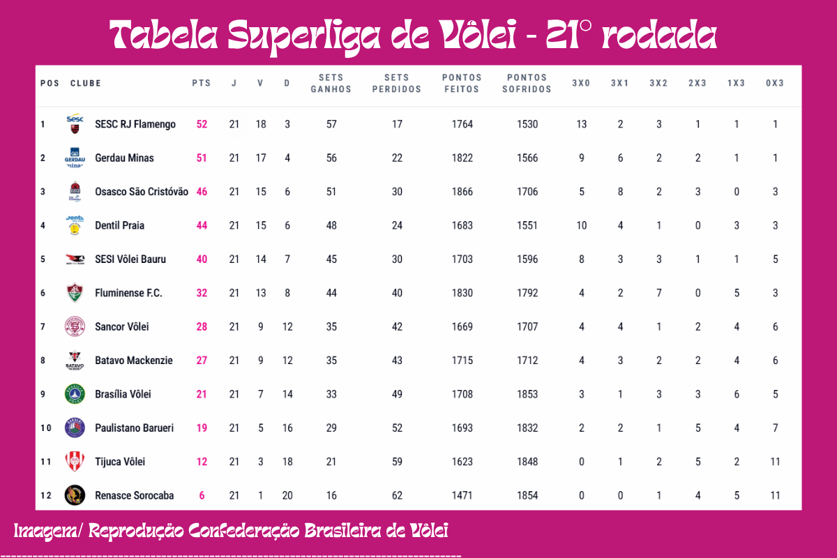 Minas Tênis Clube, que perdeu a liderança para o Sesc Flamengo na rodada anterior, é o vice-líder com 51 pontos somados e ainda tem chance de retomar a ponta da tabela mais uma vez;